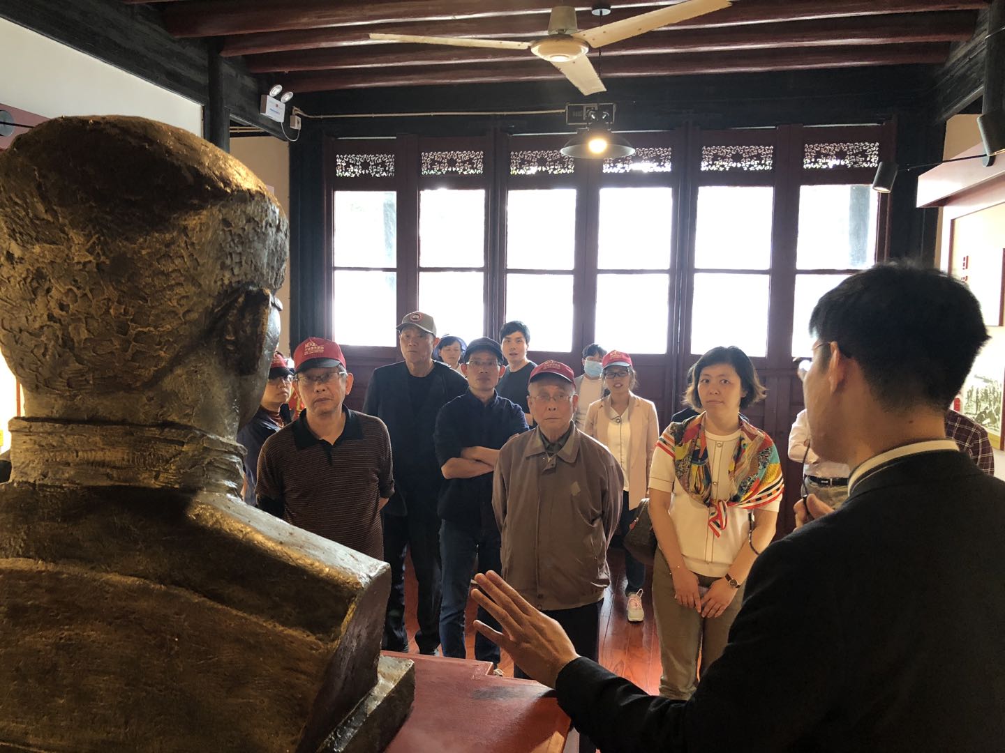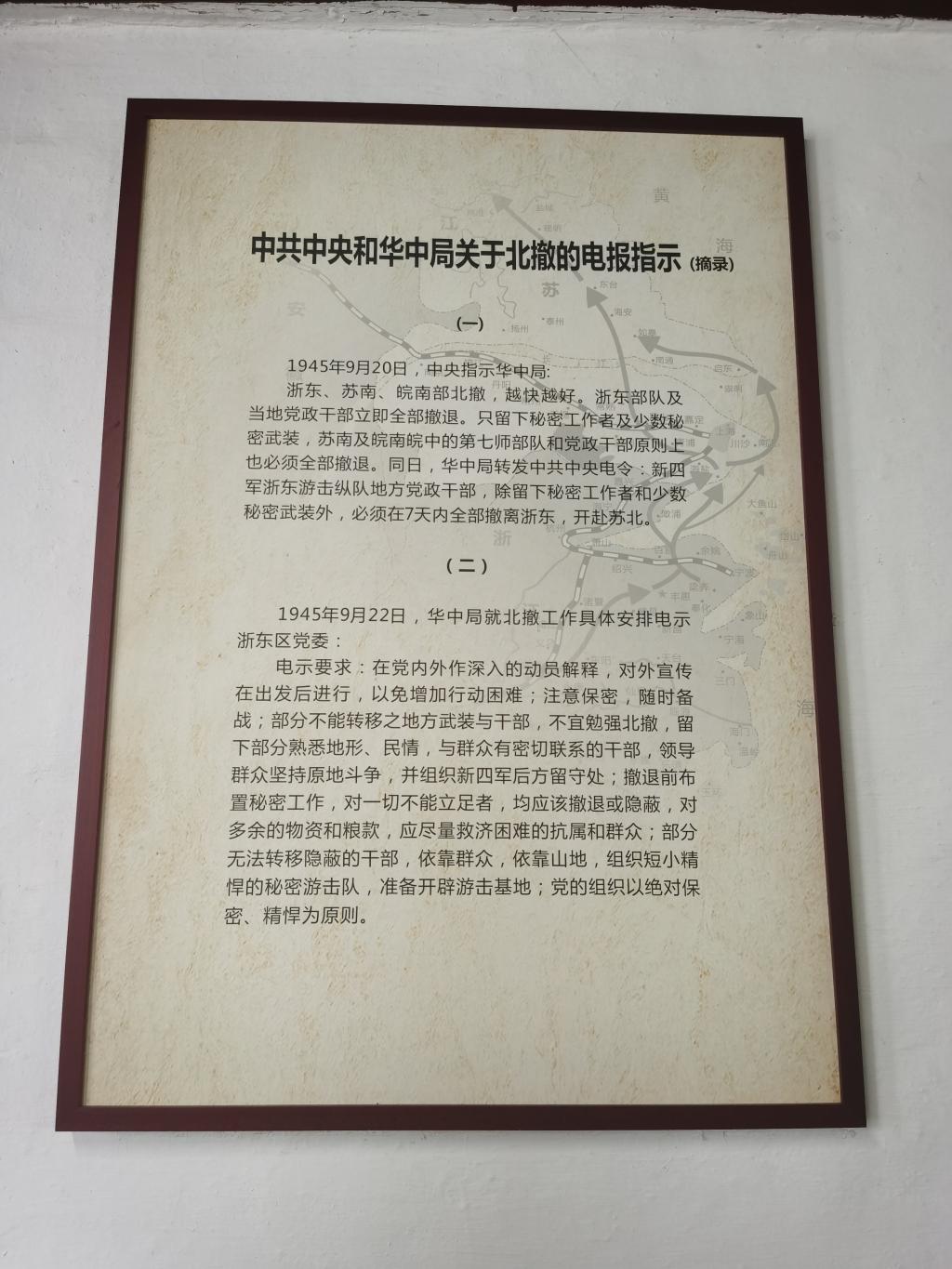 在浙东新四军北撤会议旧址,大家驻足瞻仰。这里曾是中共浙东区委和新四军浙东游击纵队司令部机关的驻地。抗日战争胜利后,为争取和平,避免内战,我党主动撤出包括浙江在内的南方8块根据地。
