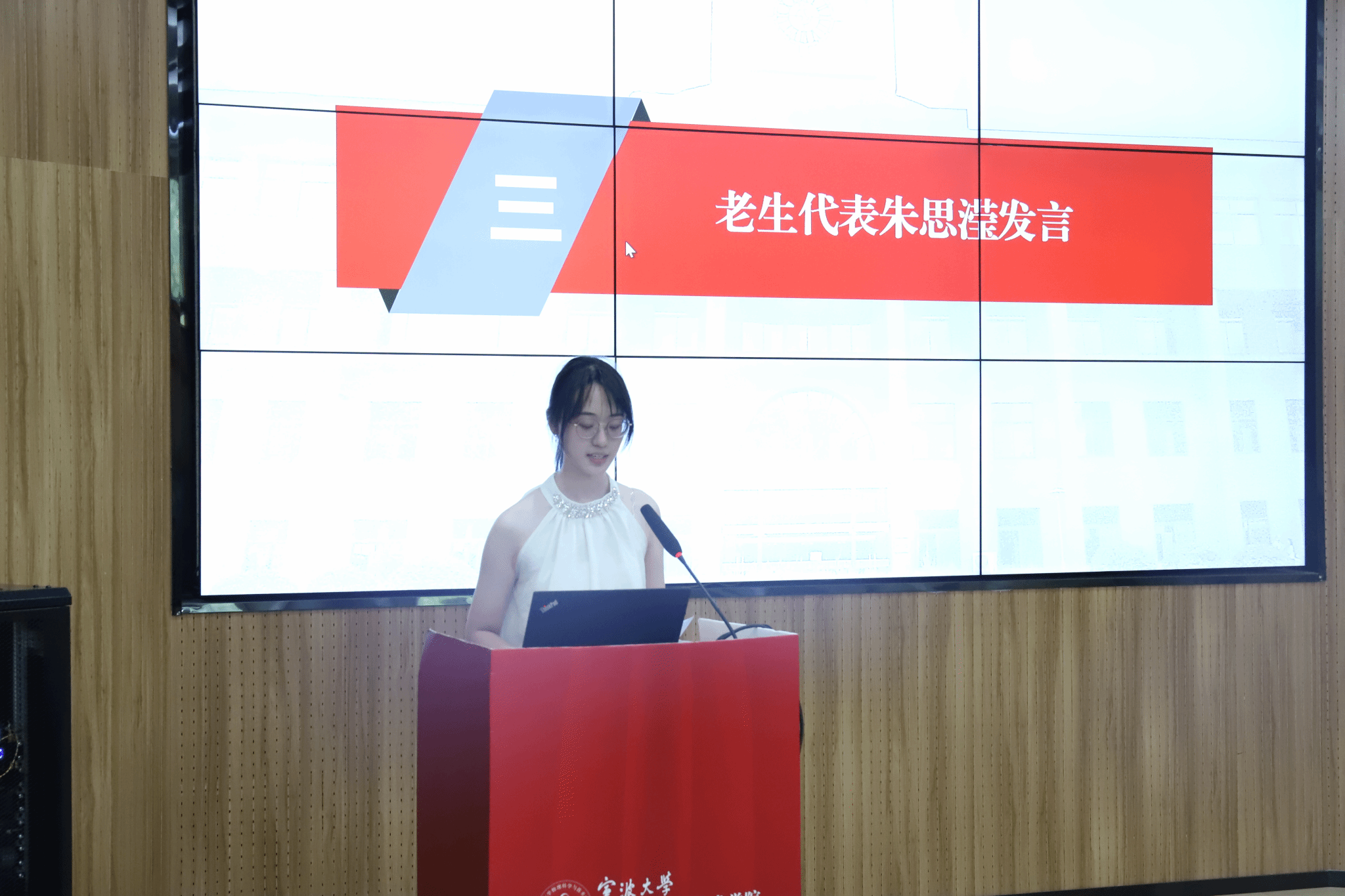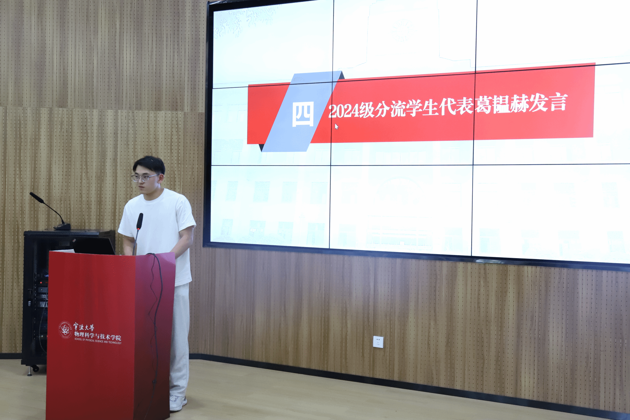 2024级微电子科学与工程专业的葛韫赫则作为分流学生代表发言,他回顾大一基础学习与竞赛,感恩一年来师长们的关心帮助,他表示自己未来将以热爱勤勉继续探索物理、贡献国家。