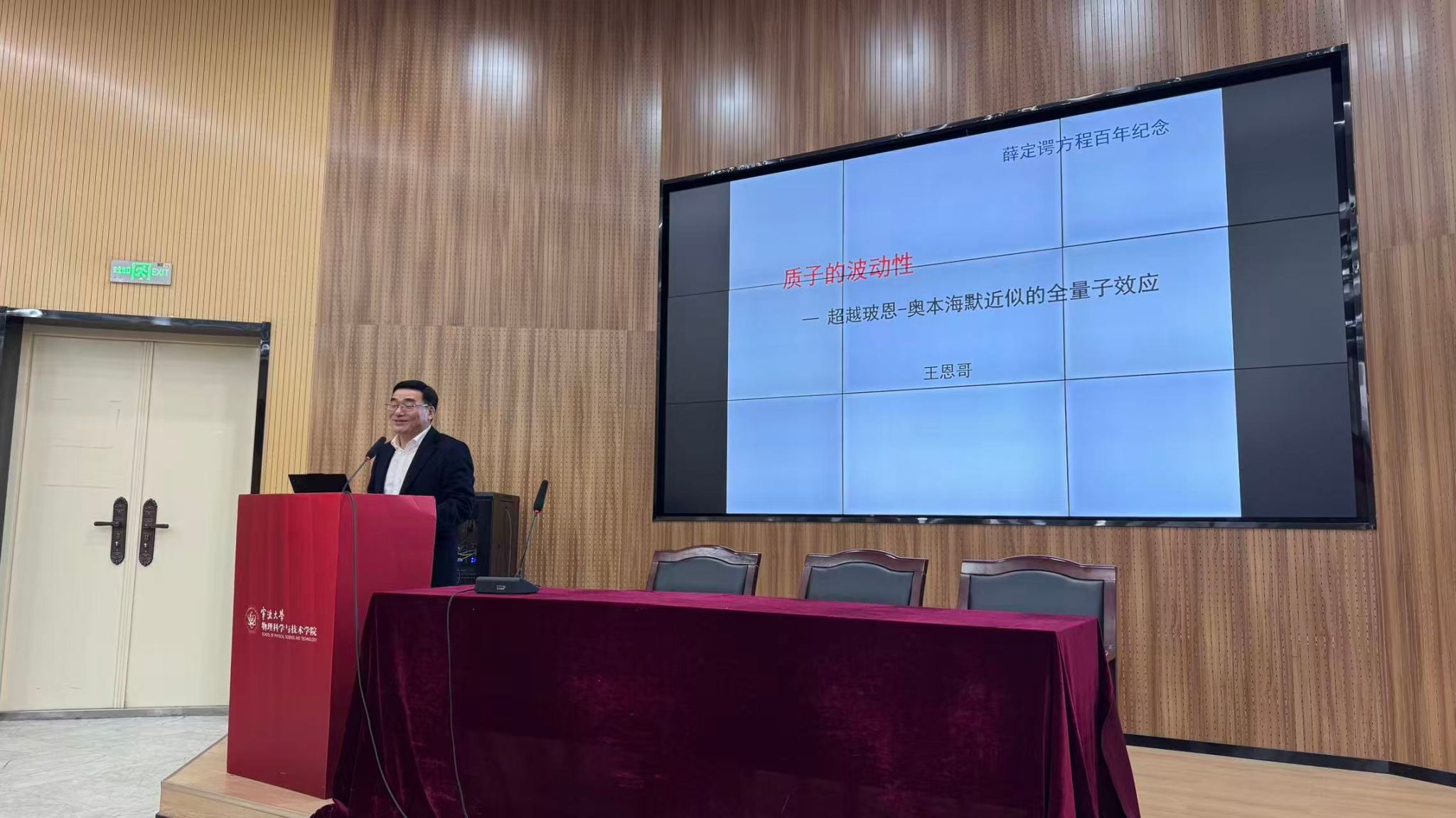 3月31日,物理科学与技术学院在龙赛报告厅举办“格物·鼎新——老司机 40周年庆物理前沿系列高峰讲坛”首场报告,中国科学院院士、北京大学教授王恩哥应邀为学院师生作题为“超越玻恩-奥本海默近似的全量子效应研究”的学术报告。本次报告会由校长蔡荣根院士主持,学院党政班子成员及200余名师生参加。