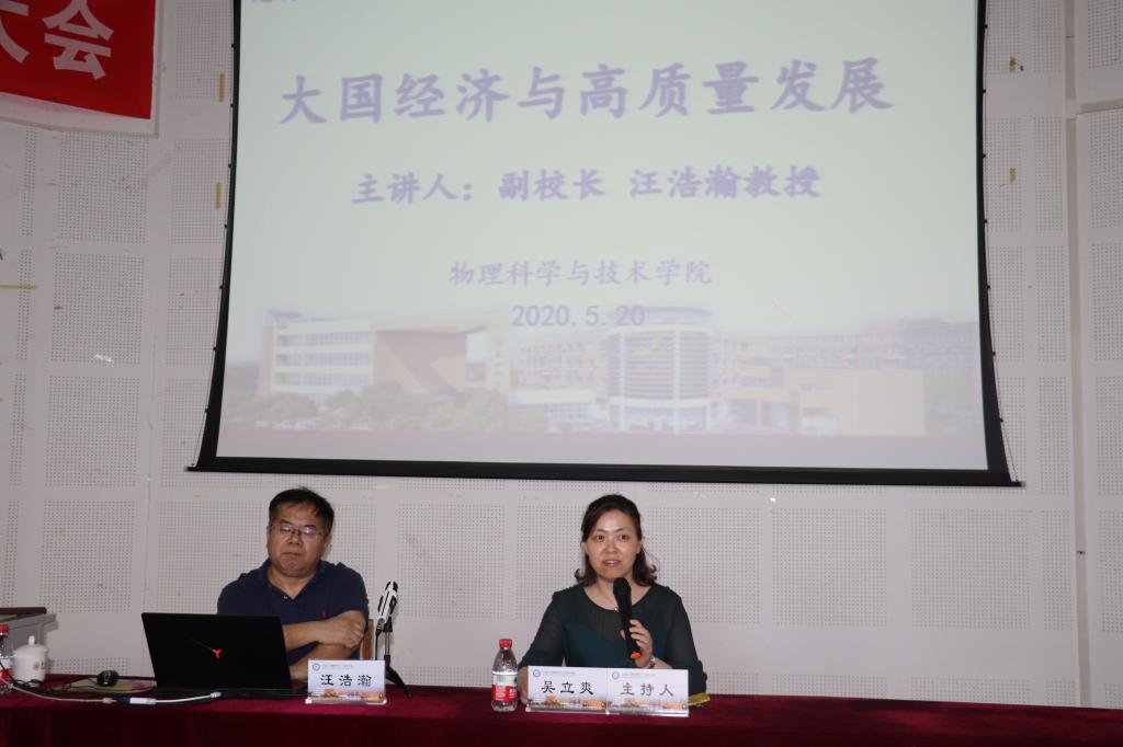 5月20日,宁大副校长汪浩瀚在龙赛报告厅为物理学院学生主讲题为“大国经济与高质量发展”的形势与政策课,此课也作为物理学院党委理论学习中心组学习扩大会学习内容,线上线下500余位师生参与听讲。