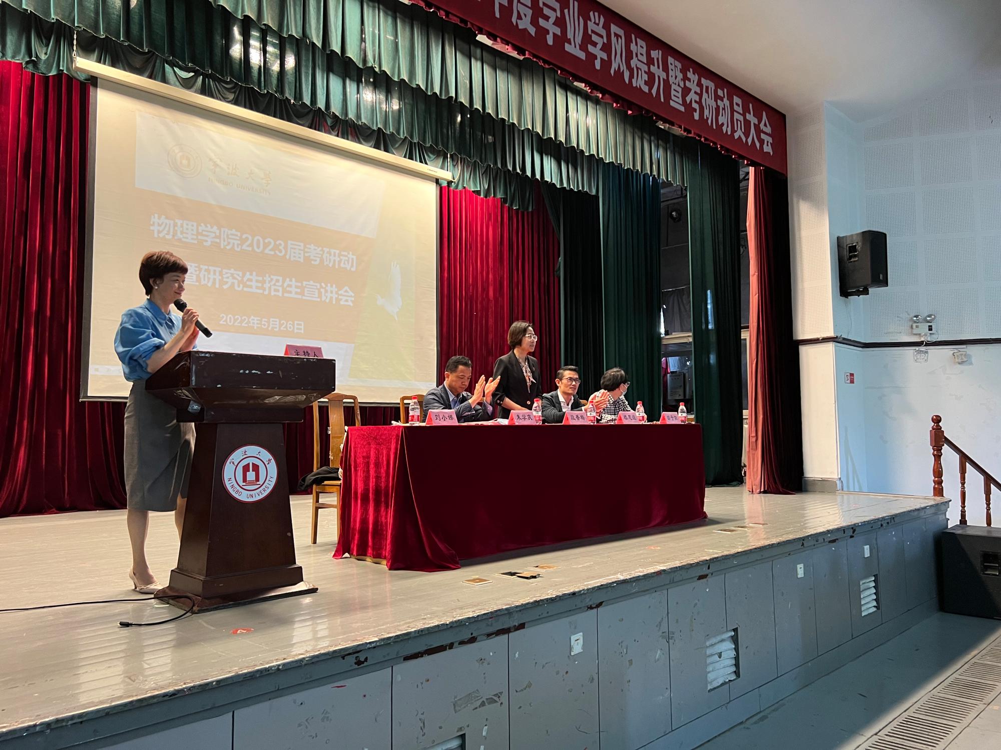 为充分调动我院2023届毕业生考研积极性,增强考研学子的信心和信念,推进学院升学深造工作进一步提升,5月26日中午,物理学院在锦绣小剧场隆重举行了2023届毕业生考研动员大会暨研究生招生宣讲会。物理学院全体党政领导出席了此次大会,各系主任、各办公室主任、19级班主任及全体2023届毕业生参加了会议。大会由学院党委副书记刘小娣老师主持。