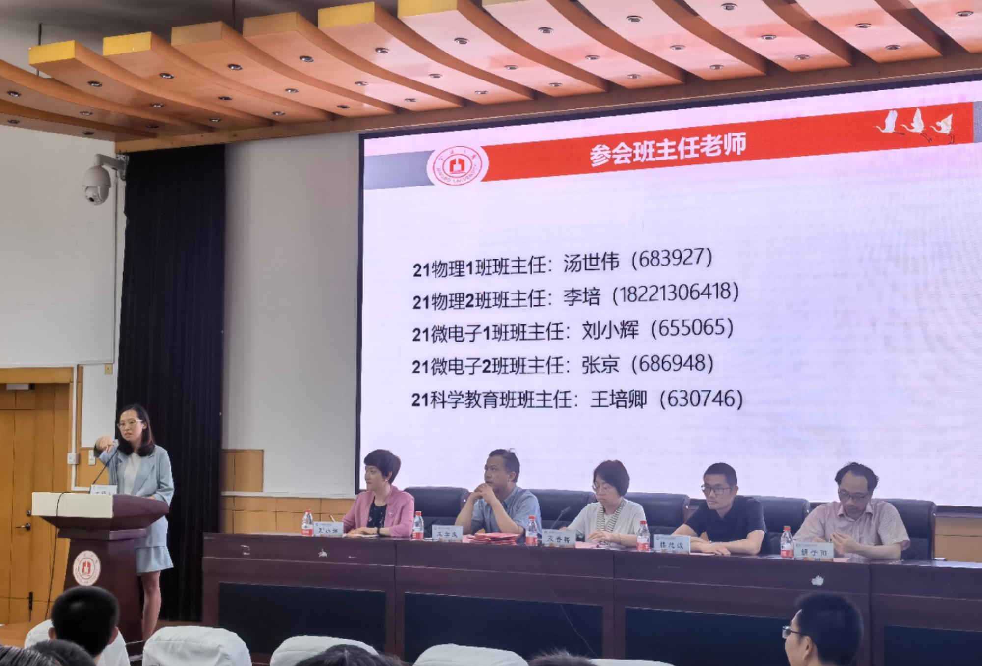 会上,执行院长段香梅代表学院致欢迎辞。她对2021级133名同学加入物理学院表示热烈欢迎,她详细介绍物理学院总体情况及物理学科发展前景,并将“人生没有白走的路,每走一步都算数”这句箴言作为定制礼物赠予每一位学生,并对同学们提出三点期许:友善待人,尊敬师长,乐于为集体作贡献,增强物院学子间的凝聚力;做好人生规划和学习规划,不虚度光阴,珍惜韶华时光;找准自身定位,努力实现自我人生价值,不给青春留遗憾。党委书记朱学庆宣读物理学院2021级本科生班主任名单并颁发聘书。