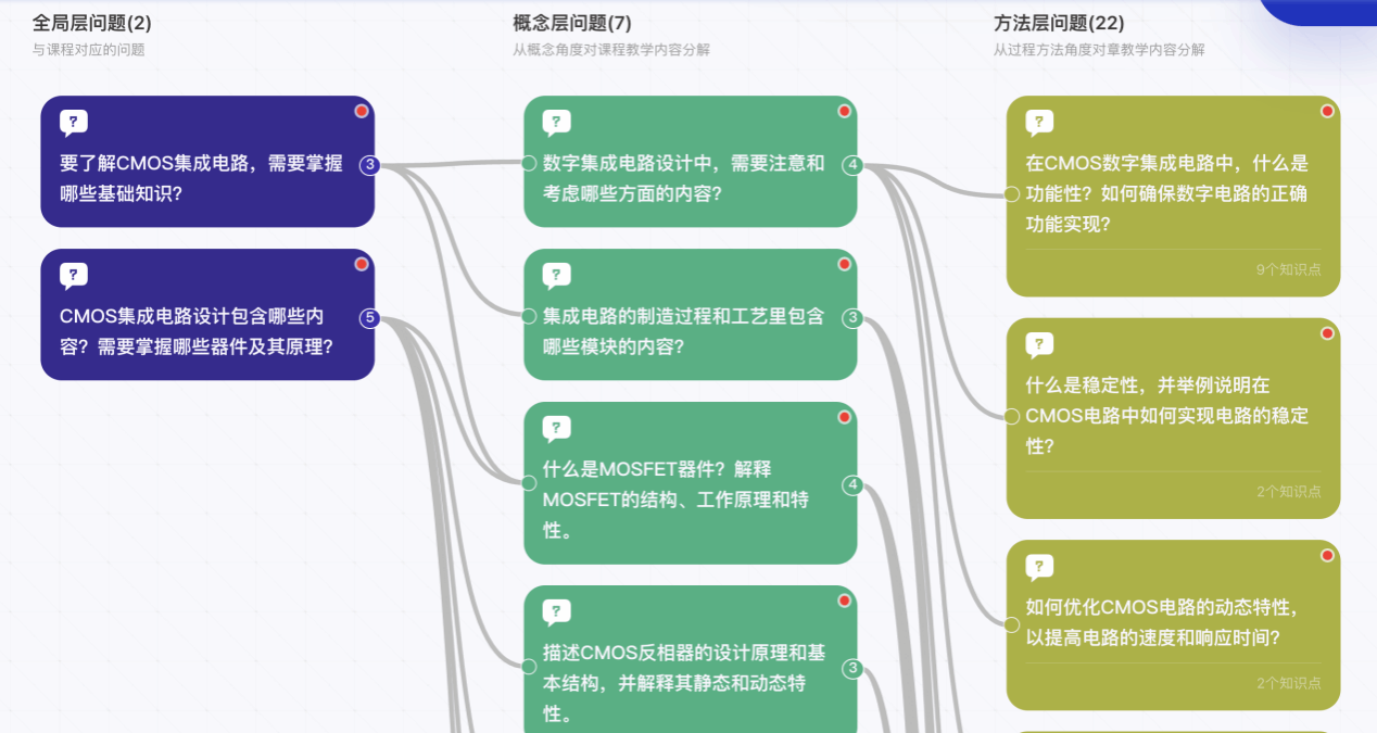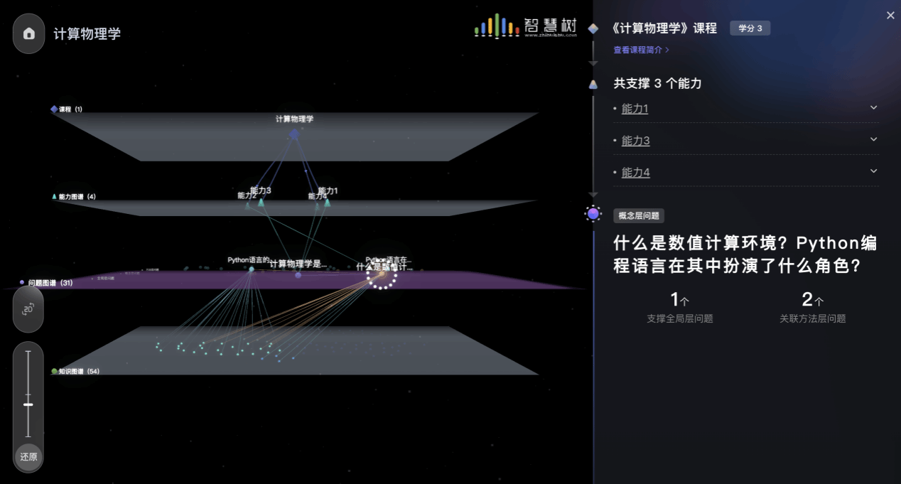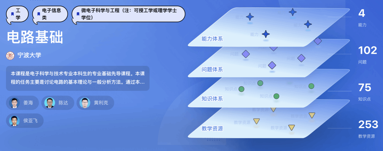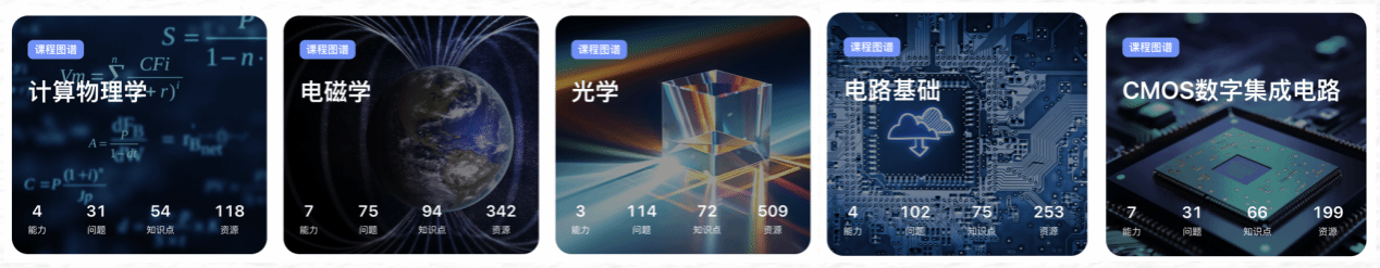 在知识图谱AI课程筹划和建设的过程中,各课程团队成员和智慧树团队一起研讨教学创新亮点,他们运用丰富的案例、互动讨论和在线实验等方式,让学习过程既富有挑战性又充满乐趣。团队聚焦课程目标、知识框架、学习逻辑等关键问题,拆解、细化专业知识。结合教学实施情况,“电磁学” 知识图谱AI课程系统搭建了7项能力目标,梳理了75个问题,94个知识点,构建了150个知识关系,拓展了342个教学资源;“计算物理学” 知识图谱AI课程系统搭建了4项能力目标,梳理了31个问题,54个知识点,构建了149个知识关系,拓展了118个教学资源;“光学” 知识图谱AI课程系统搭建了3项能力目标,梳理了114个问题,72个知识点,构建了156个知识关系,拓展了509个教学资源;“电路基础”知识图谱AI课程系统搭建了4项能力、梳理了102个问题,75个知识点,构建了131个知识关系,拓展了253个教学资源;“CMOS数字集成电路”知识图谱AI课程系统搭建了7项能力目标、梳理了31个问题,66个知识点,构建了127个知识关系,拓展了199个教学资源。每门知识图谱AI课程均包含教学资源层、知识体系层、问题体系层、能力体系层等4个维度,将每门课程的知识点有机地联系在一起,形成了一个完整的、多维度的知识网络,帮助学生全面掌握课程知识体系,加强对老司机 专业核心课程的本质认识。
