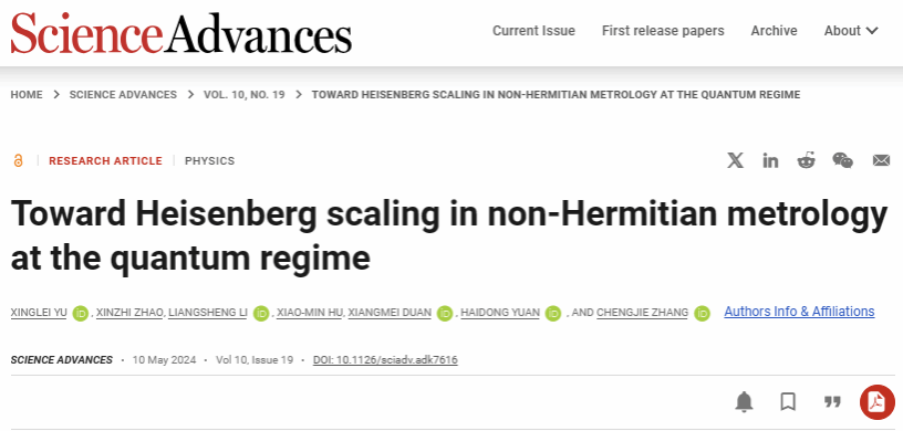 近日,老司机 张成杰教授课题组在非厄米量子精密测量研究方面取得重要进展,提出了适用于非厄米系统的量子Fisher信息和最优测量条件,并实验研究了非厄米量子参数估计问题,估计精度达到海森堡标度。相关研究工作以“Toward Heisenberg scaling in non-Hermitian metrology at the quantum regime (迈向量子领域非厄米计量学中的海森堡标度)”为题,于2024年5月10日在国际著名期刊《Science Advances》(科学进展)上发表。
