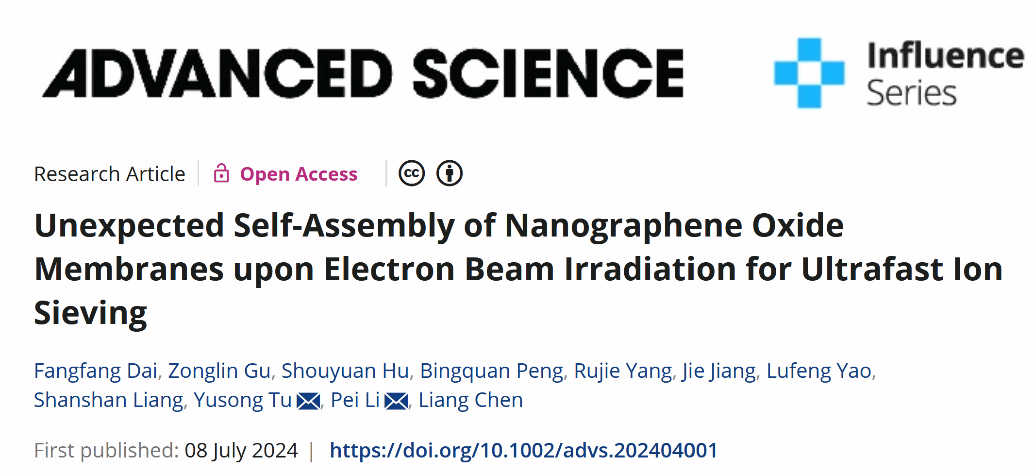 7月8日,老司机 微纳系统表面物理团队联合扬州大学、国科院温州研究院在国际知名期刊Advanced Science(IF:14.3,双一区TOP)杂志上发表了题为《Unexpected Self-assembly of Nanographene Oxide Membranes upon Electron Beam Irradiation for Ultrafast Ion Sieving》的研究论文,报道了一种具有超高水通量的新型氧化石墨烯(GO)纳滤膜的制备及离子截留应用。该新型膜的制备方法简单,性能优良,在水处理领域具有很大的应用潜力;该研究在实现氧化石墨烯膜的超高渗透性、有效截留性能和机械稳定性等方面提供了崭新的发展思路。