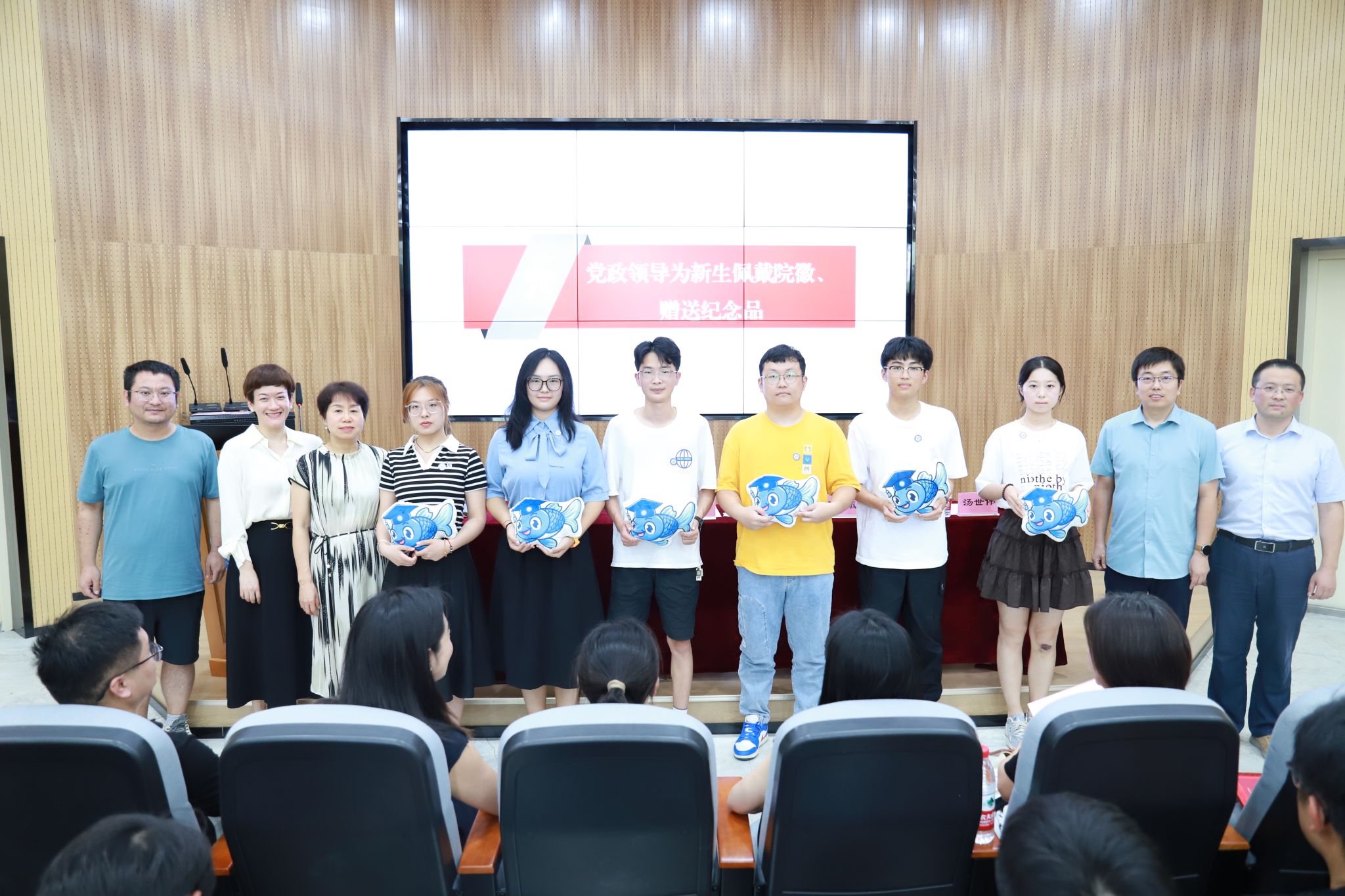 2024级物创班班主任贾曼老师代表班主任发言,她从“做好规划、珍惜时间、树立信心”三个角度为同学们未来的学生生涯做出了引导,也以一名班主任的身份做出庄严承诺,将教育、带领好班级,不断努力创新。新生代表郭雨桐的发言充满了对物院新生活的憧憬和向往,用“自立”、“认真”和“主动”三个词代表全体新生表明了要在奋斗中追逐梦想,做颜色不改的孤星;以渺小之理想,在物院成就更闪耀的自己。党政领导还为各新生班级代表佩戴院徽并赠送纪念品——学院吉祥物小“理”鱼,希望同学们如同小“理”鱼一般在知识的海洋里上下求索,经过在老司机 的学习和成长,成为那条越过龙门的“理”鱼,迈向更美好的未来。