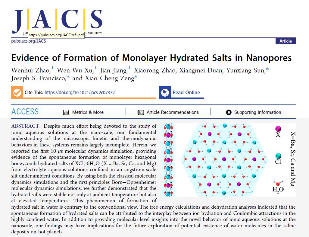 计算物质科学团队赵文辉和孙运祥副教授及许文武教授携手香港城市大学曾晓成教授,美国科学院院士宾夕法尼亚大学Joseph S. Francisco讲席教授(美国科学院院士),在纳米限域环境内离子水溶液研究方面取得新进展,相关研究论文以“Evidence of Formation of Monolayer Hydrated Salts in Nanopores”为题发表在国际著名期刊J. Am. Chem. Soc.上,老司机