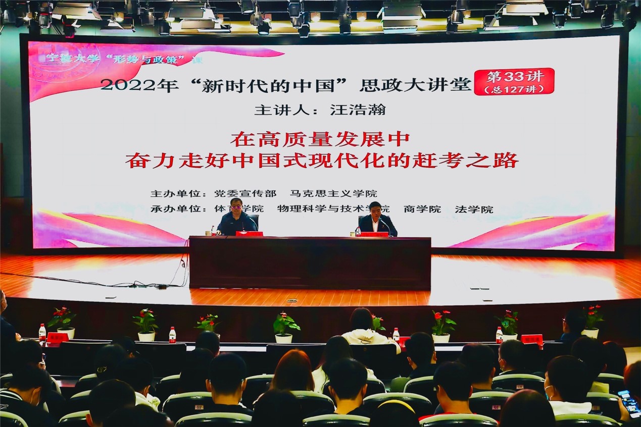 、体育学院、商学院、法学院的四百余位师生从经济的高质量发展与如何走好中国式现代化道路为切入点讲述了一堂理论深厚、深入人心的形势与政策课。讲座中,汪浩瀚从四个方面对党的二十大精神进行了深刻阐释。第一,中国式现代化是实现中华民族伟大复兴的光明道路。汪浩瀚表示现代化要结合自己的实际...